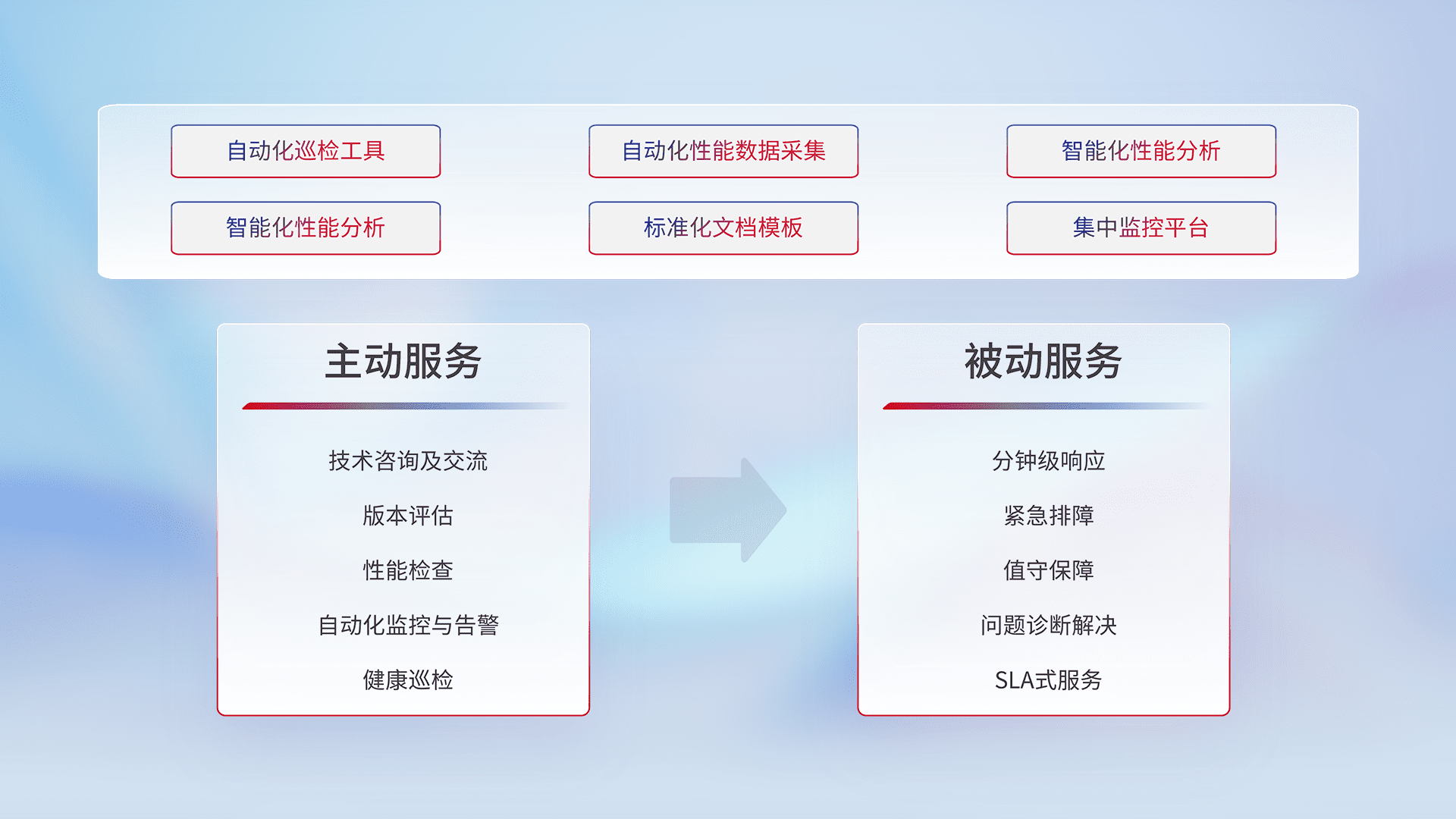 智能化工具和标准化文档,,,保障服务质量,,,,提供主动服务(包含技术咨询、、、版本评估、、性能检查、、自动化监控与告警、、、健康巡检)和被动服务包含(分钟级响应、、紧急排障、、值守保障、、、、问题诊断解决、、、SLA服务)。。。