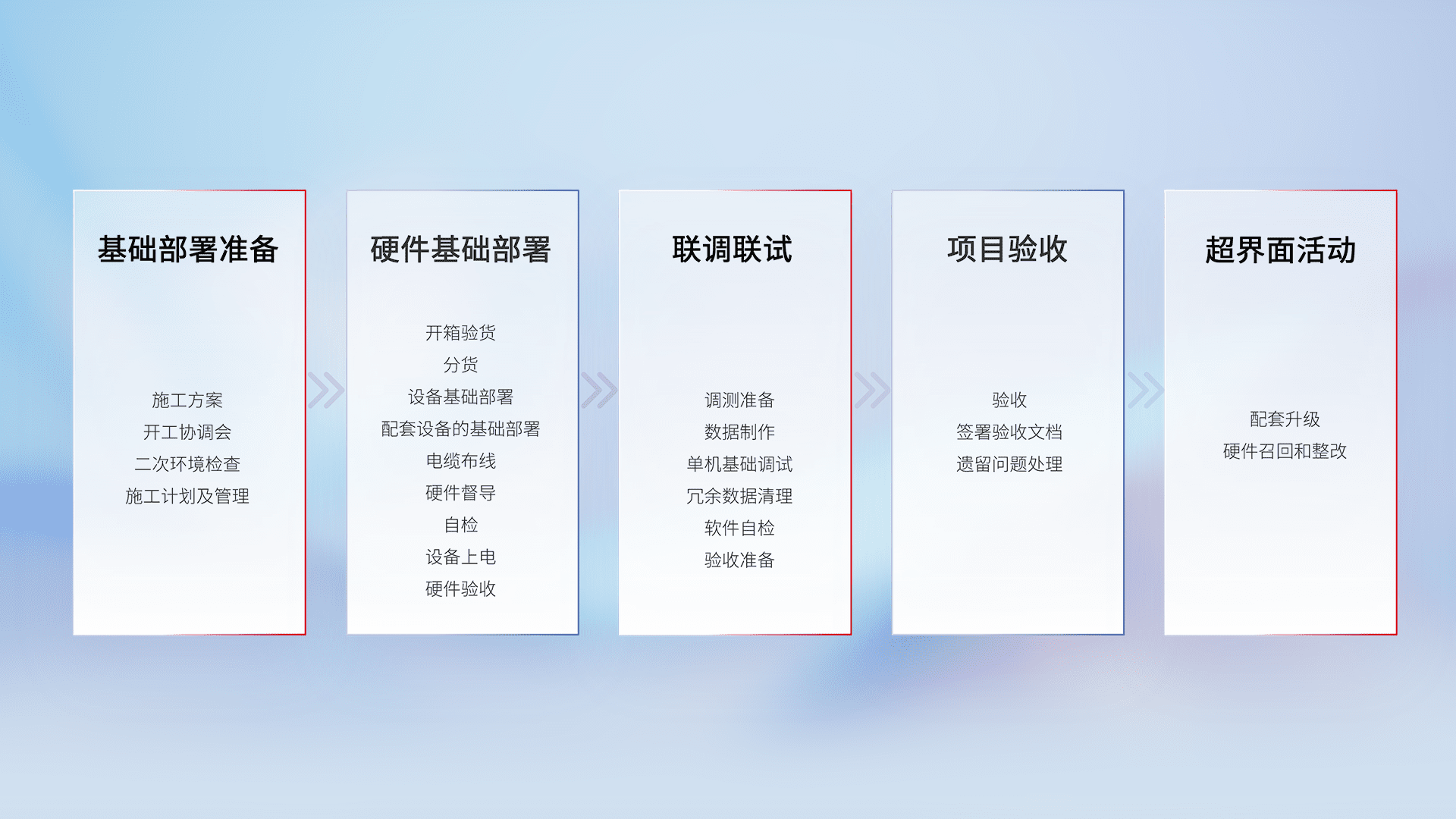 从基础部署准备、、硬件基础部署、、、联调联试、、、、项目验收、、、、越界面活动的全过程可追溯,,,保证施工质量和进度。。。。